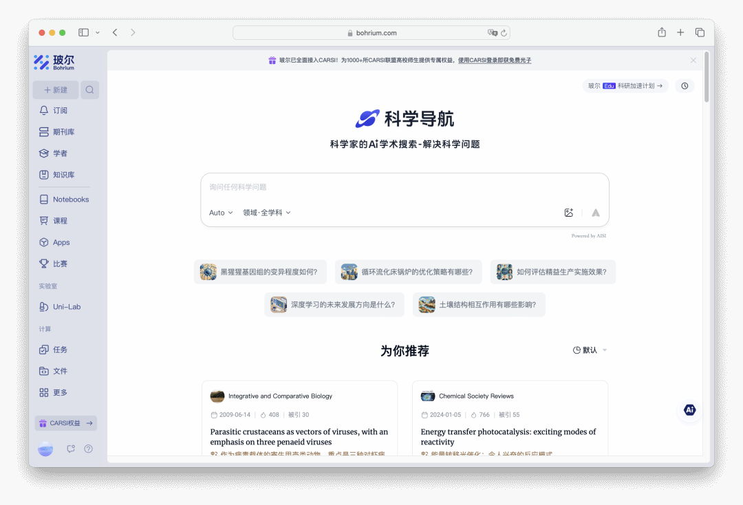 首次使用,请师生们在校园网内登录访问:https://bohrium.com,该平台已全面接入CARSI,从左下角CARSI权益进入页面的CARSI标志处登录认证后,任何地方均可使用。并支持网页端与移动端、桌面端多端同步,移动端收藏的论文可以在网页端/桌面端精读。